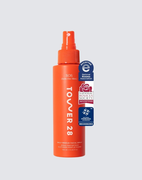 - Tower 28 SOS Daily Rescue Facial Spray – Fórmula calmante con ácido hipocloroso, recomendada para pieles sensibles o irritadas.